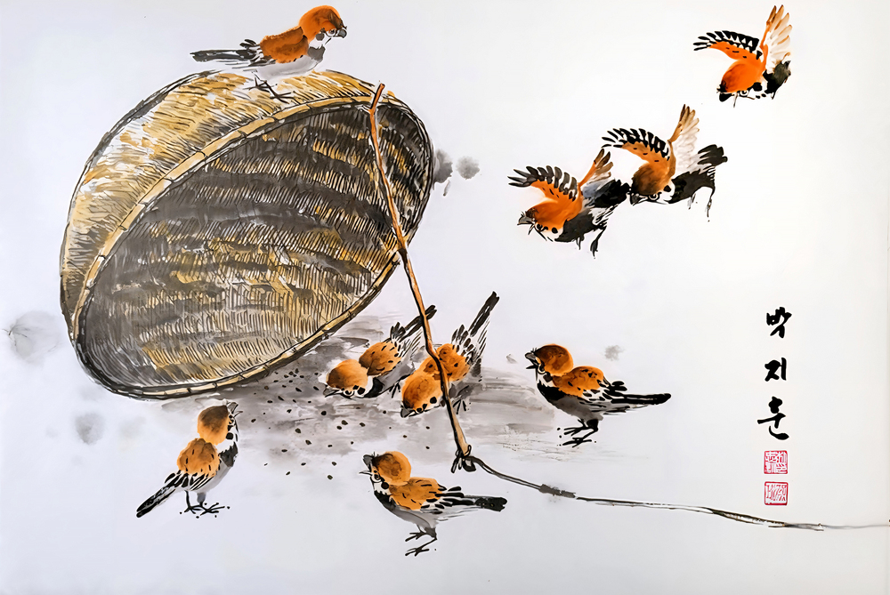 이 작품은 한지에 수묵으로 표현한 문인화로, 어린 시절 기억의 한순간을 바탕으로, 소박한 자연의 한 장면 속에 삶의 태도와 정서를 담고자 하였다. 참새 덫은 참새를 포획하는 도구로 자칫 위협적인 것이지만, 참새들이 경계하는 것이 아닌, 안과 밖에서 자유롭게 먹이를 먹는 모습을 통해, 긴장과 갈등이 아닌 자연 안에서 이미 존재하는 조화와 안정, 삶에 대한 관조를 드러내고자 하였다.